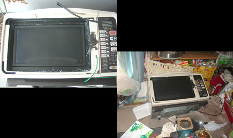 ↑飛散した食器類と、思いっ切り飛んで壊れた電子レンジw